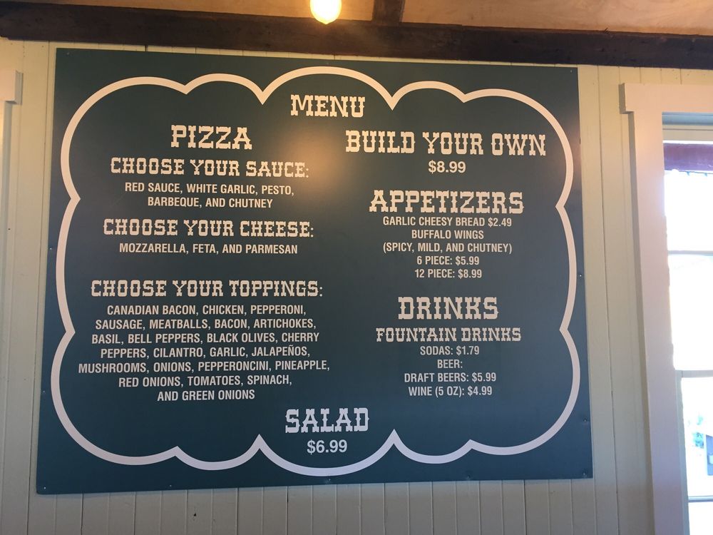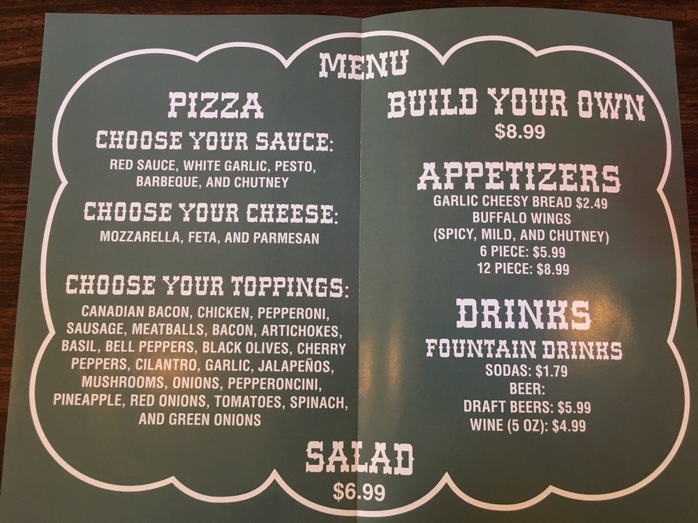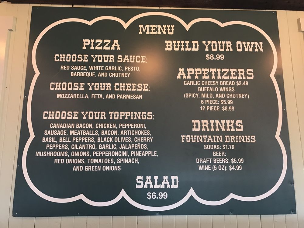 Chutney sauce (spicy blend of serrano peppers, garlic, and cilantro), mozzarella, green peppers, onion, black olives, jalapeno, garlic, mushroom